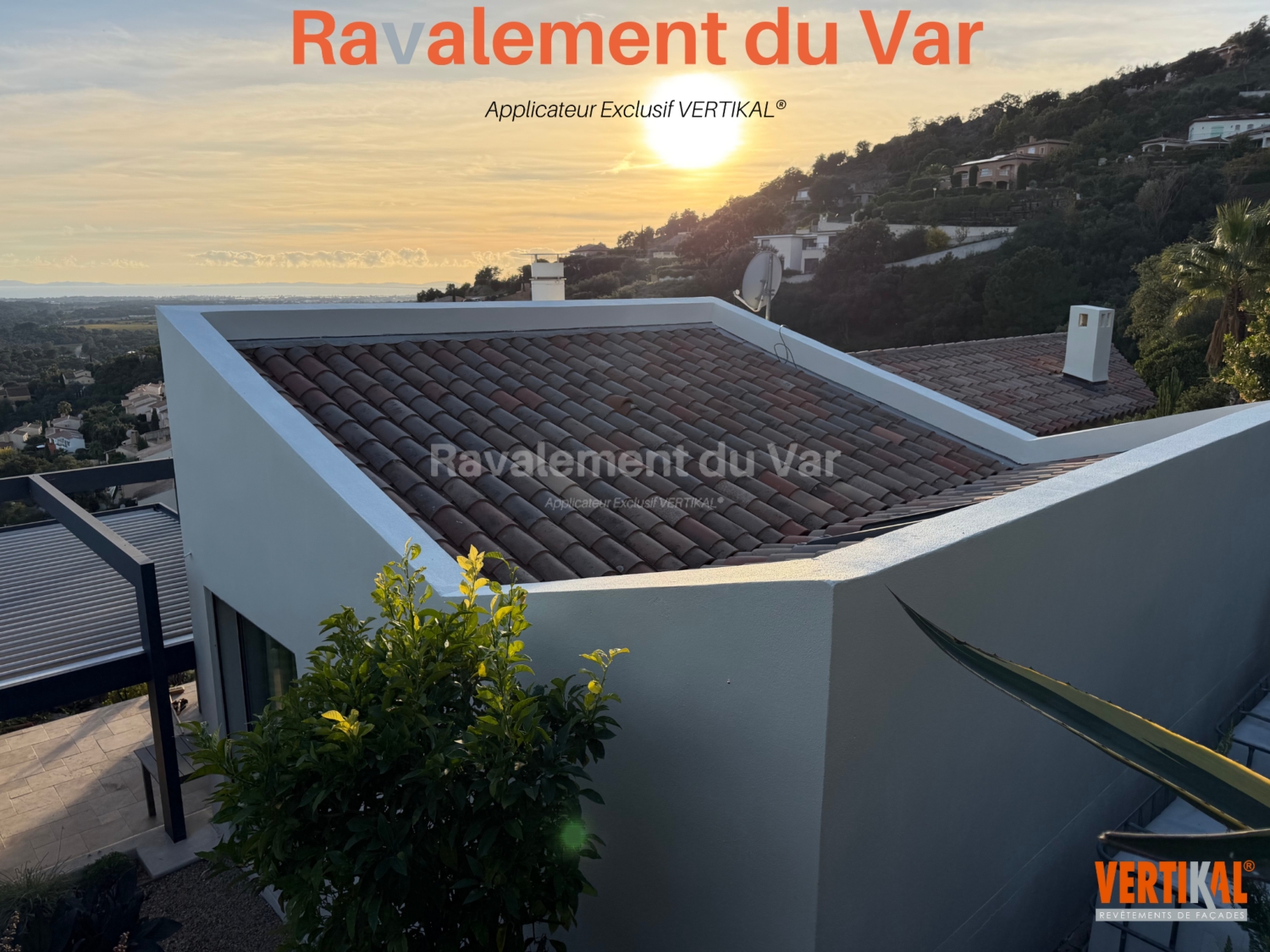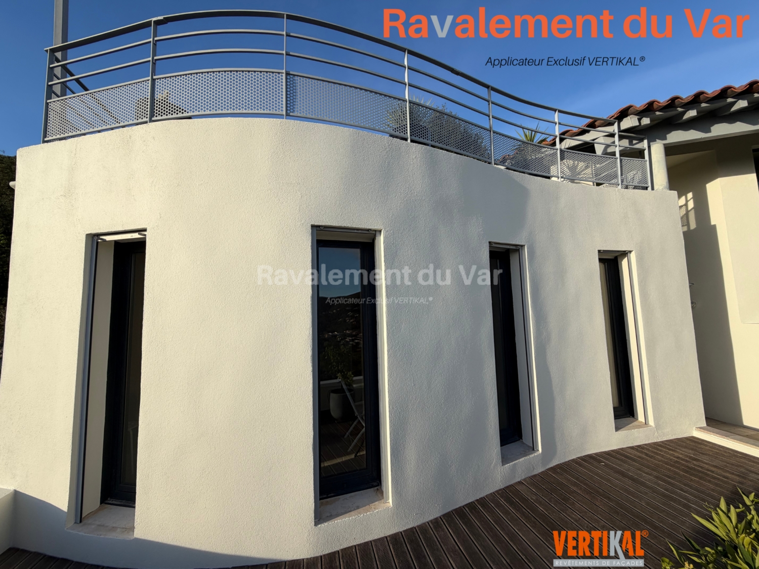 Pour la finition de ce ravalement de façades réalisé à Valcros, sur la commune de La Londe-les-Maures, nous avons choisi le VERTIKAL-FLEX V100 : un revêtement semi-épais haut de gamme, appliqué au rouleau à poils longs, spécialement conçu pour protéger les façades fissurées et exposées aux contraintes climatiques du littoral varois. Il stoppe le retour à la fissuration, garantissant la pérennité de notre travail dans le temps.